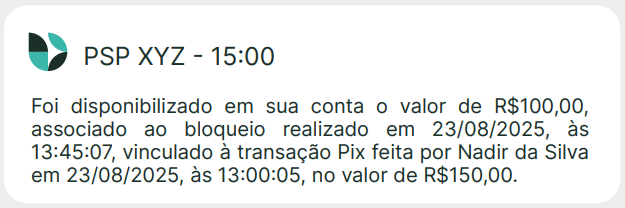 - PIX_INFRACTION_BALANCE_WAS_UNLOCKED - Indica que o saldo bloqueado anteriormente foi liberado (total ou parcial) para a conta do cliente.